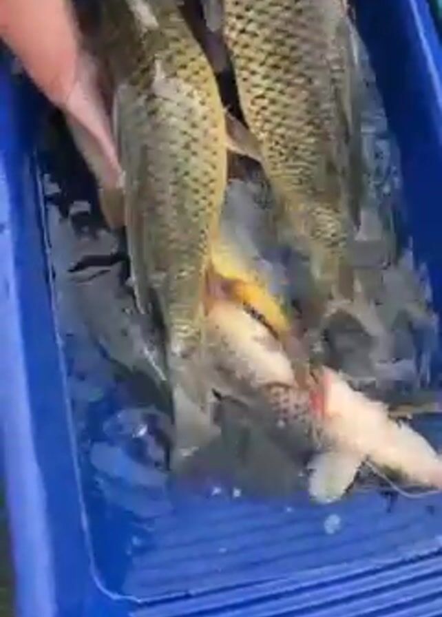 blue plastic container filled with water and several fish. Two large fish are being placed into the container. The fish have scales and appear to be various shades of yellow and gray. The container is filled with water and a few of the fish are swimming. The video is shot from above, looking down into the container.