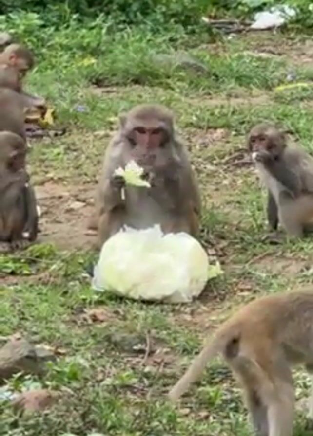 group of monkeys eating food on a grassy area. There are at least six monkeys of various sizes. One monkey sits in front of a large, white, spherical object, possibly a head of cabbage, and eats pieces from it. Other monkeys are scattered around, some eating what appears to be fruit. A hand briefly appears and points toward the monkey eating the cabbage. The environment is a green, grassy area with scattered weeds and a concrete wall in the background.