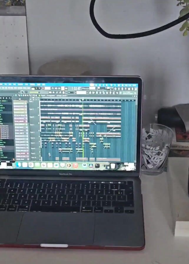 desk with a Macbook Pro playing music through FL Studio. The screen displays the software's arrangement view with numerous tracks. A JBL speaker is next to the laptop on the desk, and a condenser microphone on a boom arm stands behind it. The desk sits in front of a white wall with a Van Gogh painting and a calendar. A plant sits in the upper left corner of the screen and hangs from above the microphone stand. Under the desk, there are several bags and other items. The camera zooms in on the laptop screen.