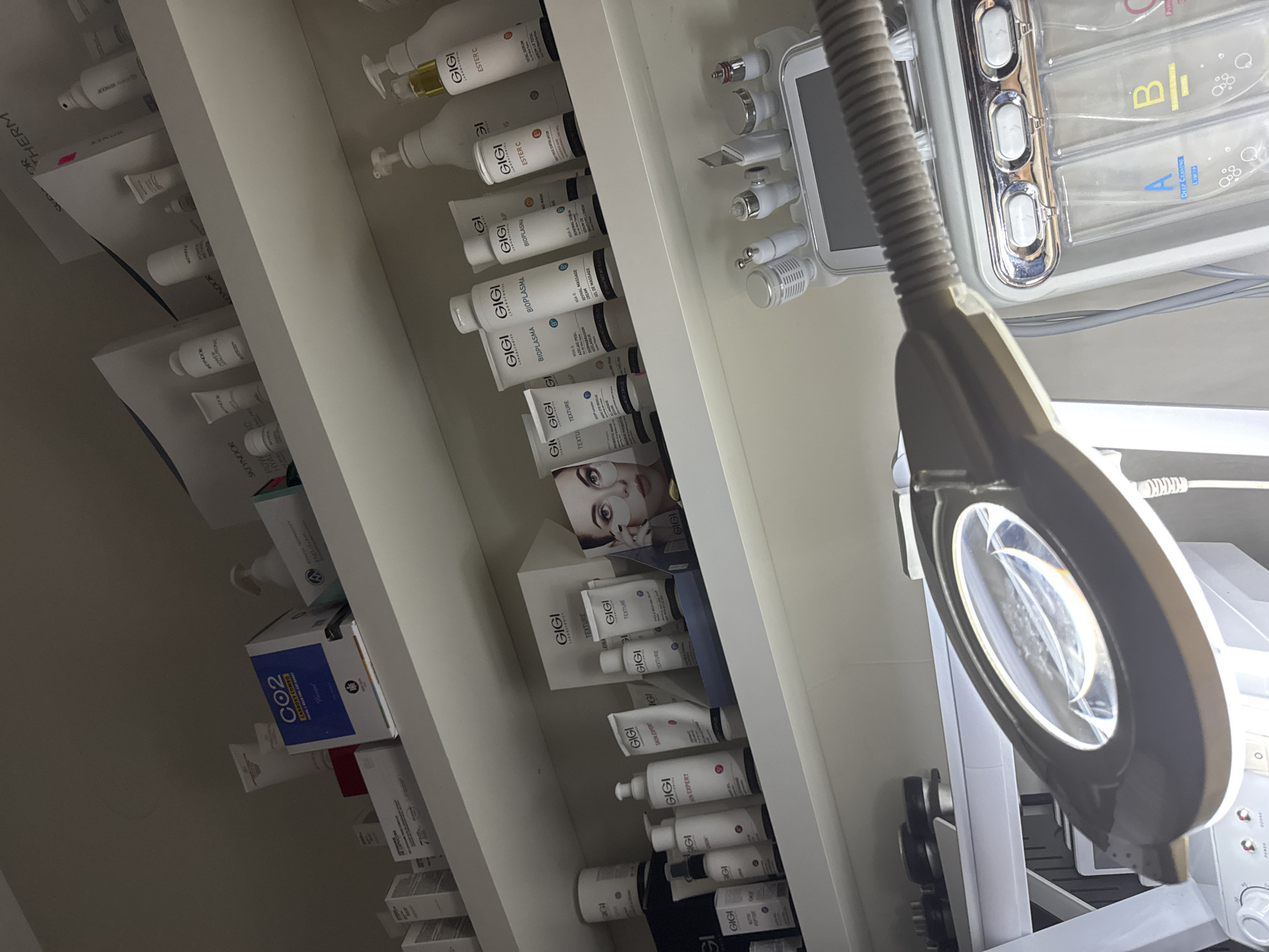 A close-up shot indoors presents a shelf filled with a variety of skincare products. The brands "GIGI" and "SKEYNDOR" are prominently visible on the packaging of creams, serums, and other beauty treatments. A magnifying lamp is positioned in the foreground. The environment seems to be a beauty salon or a spa-like setting.