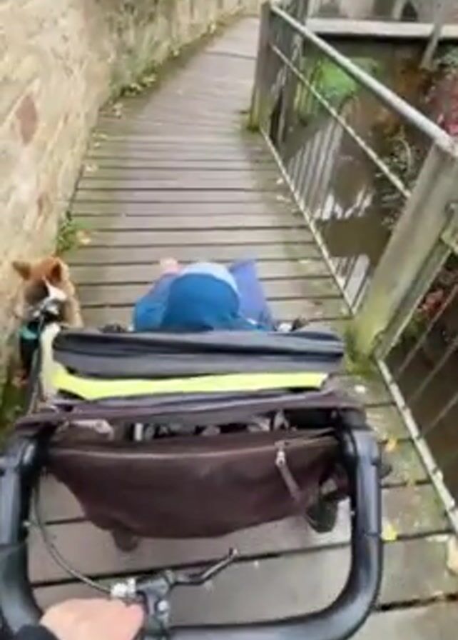 first-person perspective of someone pushing a stroller along a narrow wooden walkway. To the left is a low stone wall covered in greenery, while to the right is a canal with metal railings. A small dog on a leash walks alongside the stroller. The stroller contains items, including a blue jacket and yellow fabric. The person pushing the stroller wears blue jeans and tan shoes. The walkway is damp, and the atmosphere suggests an autumn day.