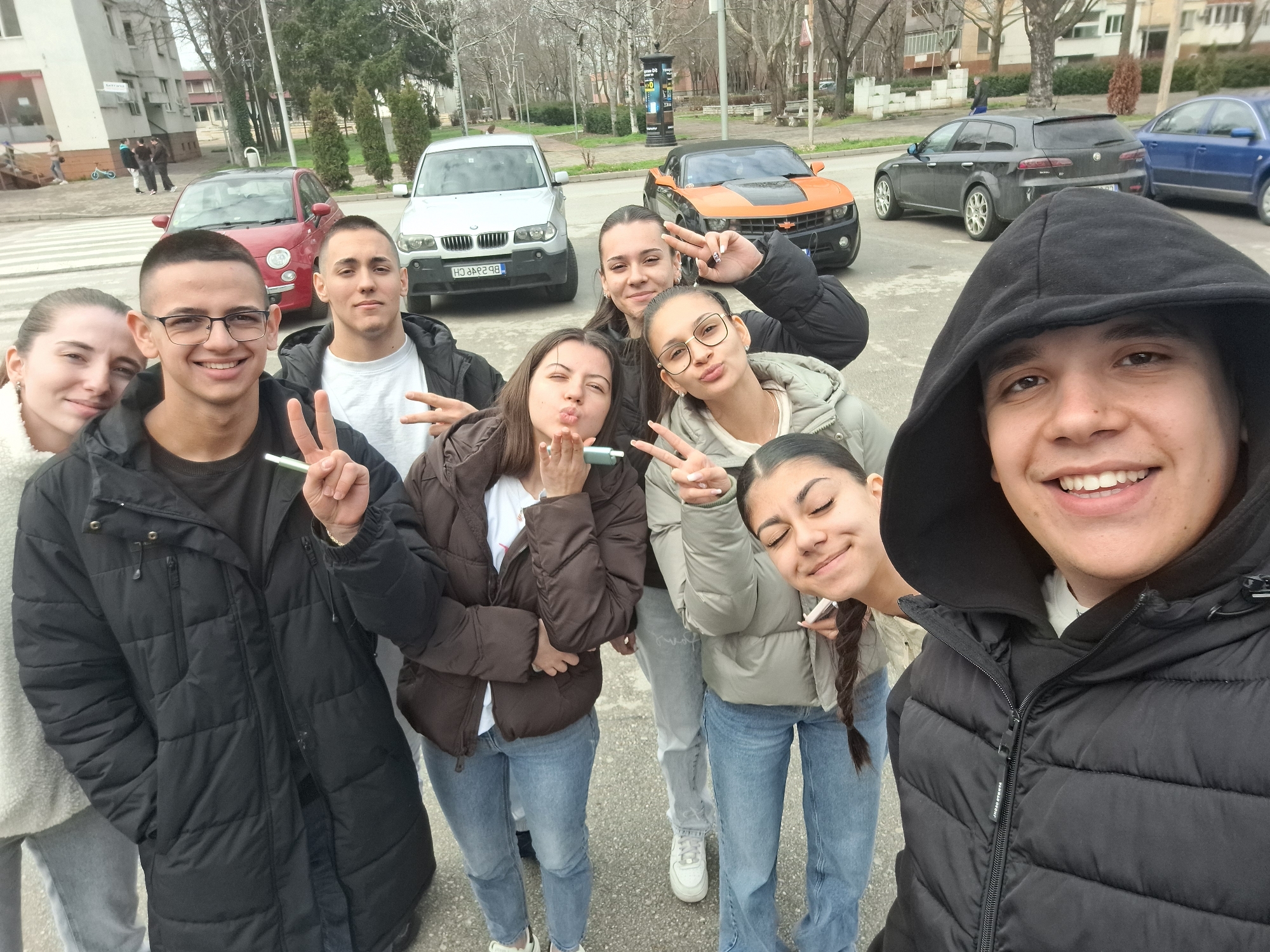 A group of nine individuals, predominantly young adults and teenagers, are captured in a wide-angle selfie on a paved street in Kozloduy, Bulgaria. The scene occurs during daytime under an overcast sky, indicated by the soft, diffused lighting and lack of harsh shadows. The individuals are dressed in winter or cool-weather clothing, including puffer jackets, suggesting cooler temperatures. In the immediate foreground, from left to right: a female in a white fluffy jacket smiles towards the camera; a male wearing glasses and a black puffer jacket makes a peace sign with his right hand and holds a green cylindrical object; another male in a white t-shirt and black jacket makes a peace sign. Behind them, a female in a brown puffer jacket playfully blows a kiss towards the camera while holding a small, light-colored object. To her right, a female in a black jacket makes a peace sign, and another female, wearing glasses and a light green puffer jacket, also makes a peace sign while puckering her lips. Partially visible on the far right, a female in a light green puffer jacket smiles with her eyes closed and holds a white object. The selfie is being taken by a male in a black hooded puffer jacket on the far right, who is smiling broadly into the camera. All visible individuals exhibit cheerful expressions. The background reveals a typical street environment with multiple parked vehicles. These include a red Fiat 500, a silver BMW X3 (with a Bulgarian license plate visible, starting 'BP', consistent with Vidin Province, where Kozloduy is located), an orange and black Chevrolet Camaro with a distinctive hood scoop, a dark gray Alfa Romeo 159 Sportwagon, and a blue Audi A4. A pedestrian crossing (zebra stripes) is visible on the street. To the left, a multi-story building with white facades stands. Further back, bare-branched trees line a park-like area, which includes a round advertising kiosk and benches. A small blue child's bicycle is also discernible near the buildings in the background.