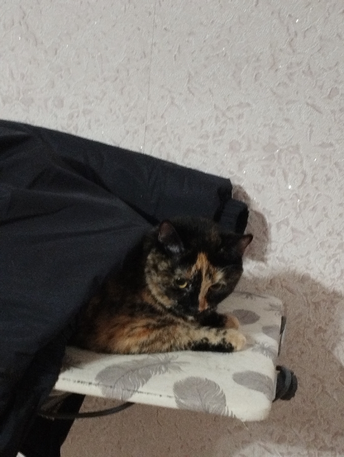 - "This indoor scene, situated in the city of Saratov, Russia, features a tortoiseshell cat resting on an ironing board" by FM-7XG4W2, licensed under CC BY 4.0