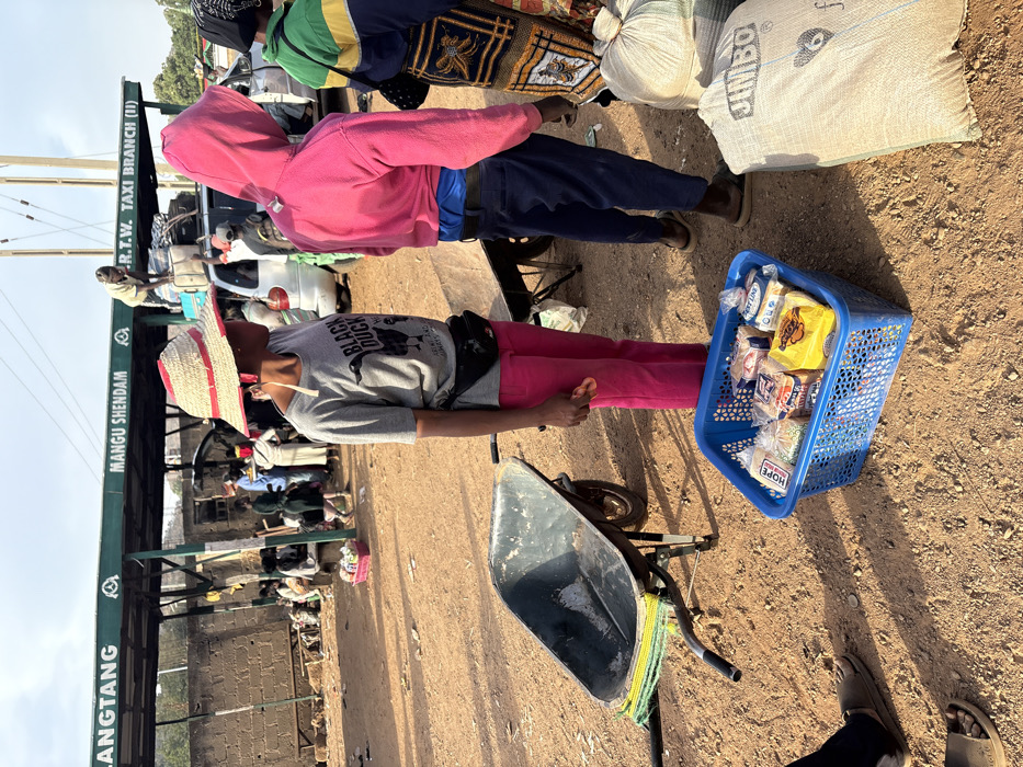 A woman with a straw hat and grey shirt is pushing a wheelbarrow with a blue basket of bread on top. The setting is outdoors, on a dirt ground, near a building labeled "MANGU SHENDAM R.T.W. TAXI BRANCH (11)". Another person wearing a pink hoodie and blue pants stands in the background. Sacks labeled "JAMBO" are also visible.