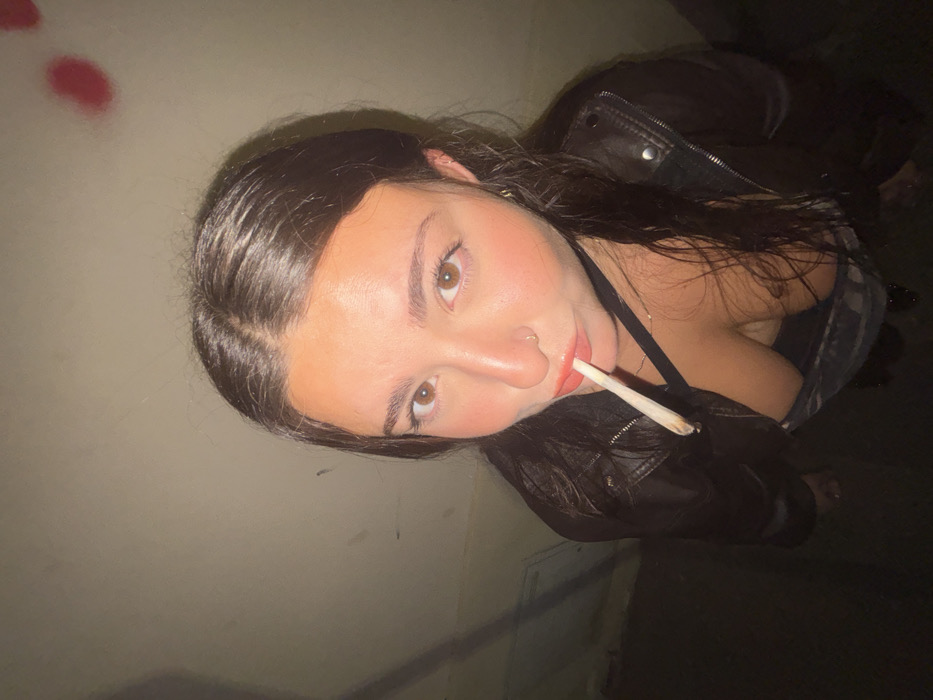 A young woman with long, dark hair and light brown eyes poses while holding a rolled cigarette between her lips. She is wearing a black leather jacket over a patterned top. The background consists of a light-colored wall with a few markings, transitioning to a darker area. The image appears to have been taken in low lighting conditions.