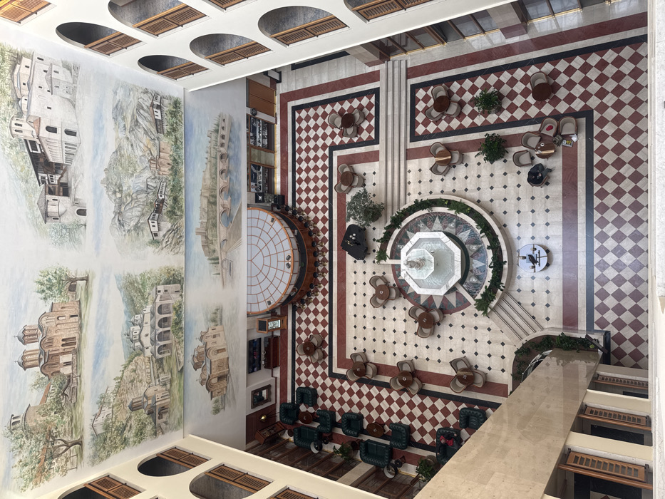 This image presents a high-angle, overhead view of the grand atrium lobby within the Hotel Aleksandar Palace, situated along Boulevard "8th September" in Skopje, North Macedonia. The scene reveals a multi-story indoor space with a high ceiling adorned with extensive murals. These murals depict various Macedonian historical and religious landmarks, including churches, monasteries (e.g., St. Panteleimon Monastery, St. Jovan Kaneo), the Stone Bridge, and Kale Fortress, rendered in a detailed, painterly style across several horizontal bands. The architectural elements on the upper floors consist of arched openings with dark wooden railings and louvred shutters, set against light-colored walls. The ground floor features a dominant checkered pattern of red/maroon and white/cream tiles, interspersed with solid and striped borders in matching colors. A central hexagonal, tiered stone fountain spouts water, encircled by a raised planter filled with green foliage. Seating arrangements are distributed throughout the floor: * On the left side, multiple groups of dark green leather armchairs are arranged around small, round wooden tables. * Scattered across the checkered areas are numerous clusters of light-colored upholstered chairs with curved backrests, paired with similar small, round wooden tables. * Towards the rear-right, a prominent semicircular bar with a light-colored counter and an overhead domed structure features approximately 16 dark bar stools. * Additional seating areas, including low dark tables, are present near the fountain. Several large potted plants and small trees are strategically placed as decorative elements. The area is devoid of people, and no specific actions or interactions are occurring. The lighting suggests a bright, possibly naturally illuminated, interior space.