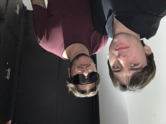 Two men stand side-by-side, one wearing dark, futuristic sunglasses and a maroon t-shirt, and the other in a black hoodie over a gray shirt. They are indoors, with a dark-colored cabinet behind the man in sunglasses and a white wall behind the other man. The image appears rotated counter-clockwise.