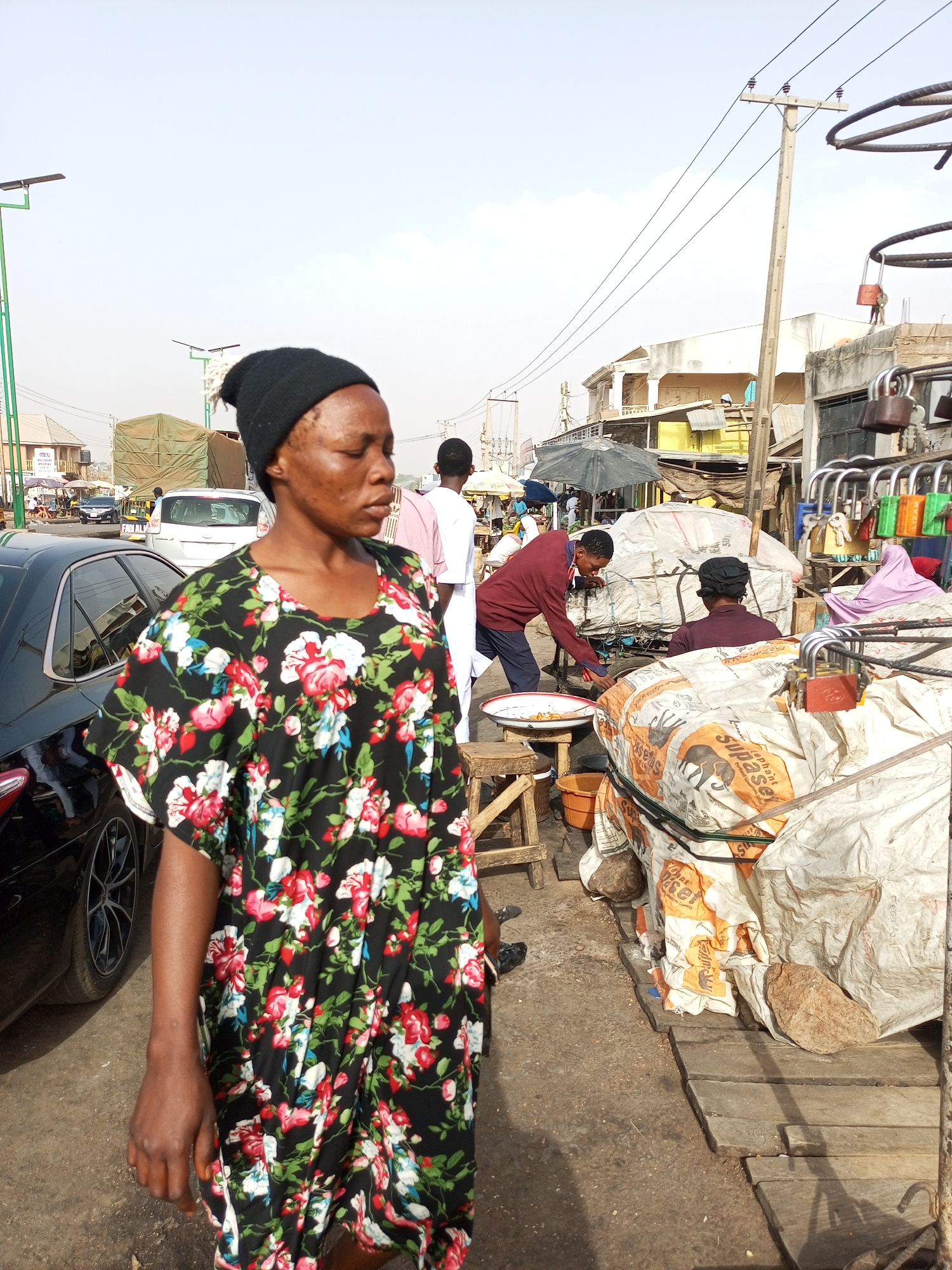 The scene depicts a bustling outdoor street or market area in the city of Tempure, Nigeria, under a clear, bright sky. In the immediate foreground, an adult female with dark skin, wearing a black beanie and a black, short-sleeved floral dress (featuring red, white, pink, blue, and green flowers), walks towards the viewer's right. Her eyes are partially closed or cast downwards, and she exhibits visible marks on her forehead and upper cheek. Behind her, to the left, the rear of a black sedan is visible on what appears to be an asphalt road with visible traffic, including a white car and a truck with a green tarp further down the street. Green solar-powered streetlights are mounted along the road. To the right of the foreground woman, the middle ground is occupied by market activity. A man in a maroon long-sleeved shirt and dark trousers bends over a wooden stool, engaged with items on a white metal tray containing what appear to be food items. Behind him, another individual in a dark top and head covering is partially visible, also engaged with goods. Large bundles wrapped in white or beige tarpaulins, secured with ropes and featuring "SUPER" and "ELEPHANT" branding, are stacked on the ground and elevated on wooden planks. An orange bucket rests near the base of the bundles. Further to the right, a prominent display of various padlocks (silver, gold, and colored) hangs on a metal rack. A dark, open umbrella is visible in the background, near other indistinct market stalls and buildings. Utility poles with multiple power lines crisscross the upper right portion of the image. The background features various commercial or residential buildings of varying states, some with exposed concrete or partially painted facades.