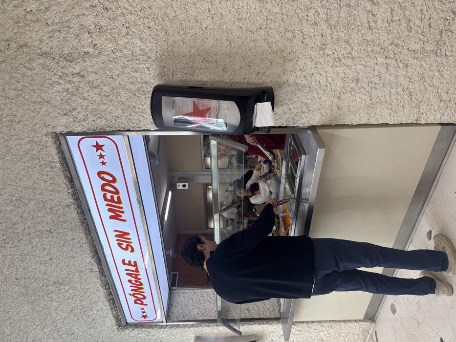 A person in a dark sweater and blue pants stands at a counter looking at a display case filled with food. Behind the counter, another person serves food. A black napkin holder with a red star is on top of the counter. Above the counter is a sign that reads "**PONGALE SIN MIEDO**" with stars on either side of the phrase. The floor is tiled, and a carpet is visible above the counter.