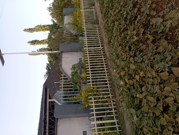 The scene is set in Rido, Nigeria, under a clear, bright sky. The foreground features a densely vegetated ground patch covered primarily by broad-leafed green plants, resembling a groundcover or vine-like crop, with areas of exposed reddish-brown soil. Immediately behind this, a white picket-style fence, composed of vertical slats and horizontal rails, spans across the midground from left to right. Behind the picket fence, a low, light-colored concrete wall, approximately waist-height, runs horizontally. Portions of this wall are topped with coiled razor wire (barbed tape) visible towards the left side, indicating security measures. Dense, green foliage, consisting of various bushes and smaller trees, grows both in front of and behind the concrete wall, partially obscuring it and extending above its height. In the background, behind the wall and foliage, the dark-tiled roof of a building is visible on the left, complete with a white downspout. Towards the center and right, a tall, slender pole, light in color, stands vertically, topped with a solar panel and an integrated lighting fixture. Several tall, columnar trees with dense green foliage are also prominent in the background, contrasting with the clear sky. No individuals or discernible activities are present in the image.