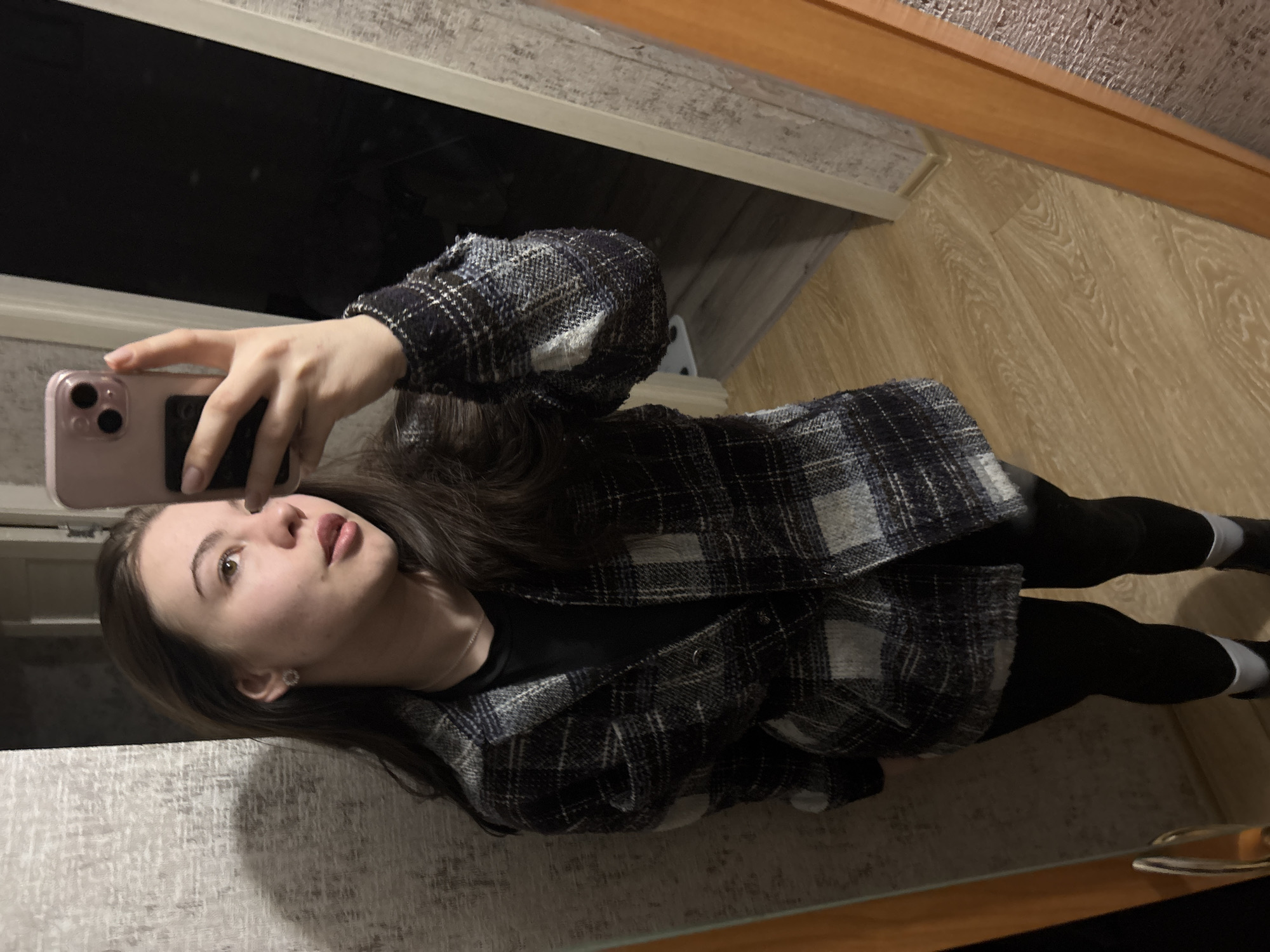 A young woman takes a selfie in a room. She's holding a pink phone with a multi-camera setup. She wears a black-and-white plaid shirt over a black top and black leggings with gray socks. The background shows a wooden floor, a patterned wall, and what appears to be a window. Location: Perm, Russia.