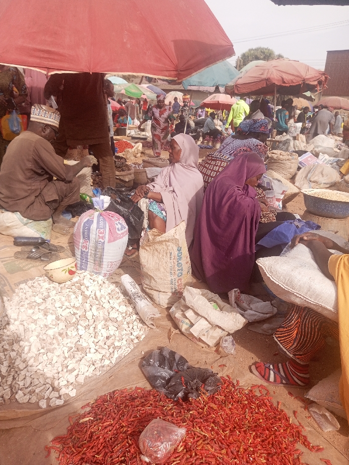 This image depicts a bustling outdoor market scene in Kakuri Gwari, Nigeria