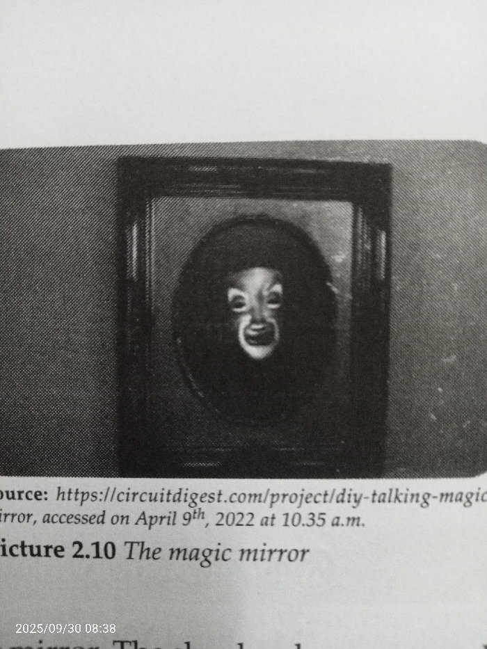 The image is a black and white photograph of a printed page, displaying a framed "magic mirror" as its central subject. The mirror is depicted within a dark rectangular frame, containing a circular dark surface. Within this dark circular area, a distinct, light-colored, stylized face-like form is visible. This form exhibits exaggerated features, including wide, upward-sloping eyes, a small central nose, and a broad, upturned mouth, creating an unsettling or grinning expression. Below the image, printed text indicates "Source: https://circuitdigest.com/project/diy-talking-magic-mirror, accessed on April 9th, 2022 at 10.35 a.m." and is titled "Picture 2.10 The magic mirror". A digital timestamp, "2025/09/30 08:38", is present in the lower-left corner of the overall photograph. The content of the image provides no visual or textual information to determine a specific location in the city of Kasioni, Kenya. No people are directly depicted within the mirror or on the page itself, and no actions or interactions are occurring. The environment is limited to the printed page and its static content.