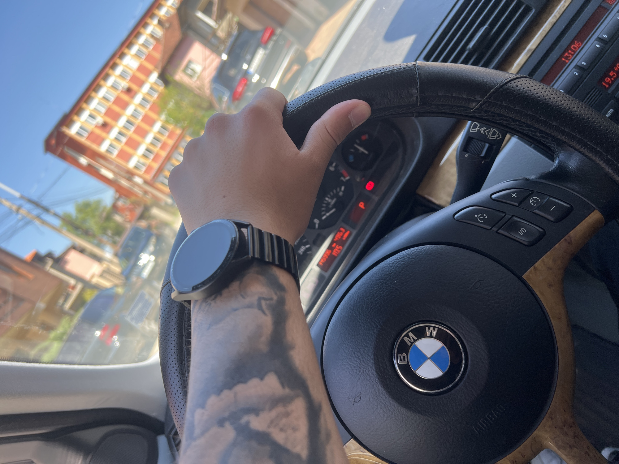 interior of a BMW car, with the steering wheel and dashboard in focus. A person's hand is visible on the steering wheel, with a black smartwatch on their wrist. The person has a tattoo on their arm. The dashboard displays a temperature of 19.5°C and a time of 13:06. The BMW logo is prominent on the steering wheel. Through the windshield, a building with orange and white facades is visible, suggesting an urban environment. Based on this, the location is potentially within Montana, Bulgaria. A grey car is also visible through the windshield.