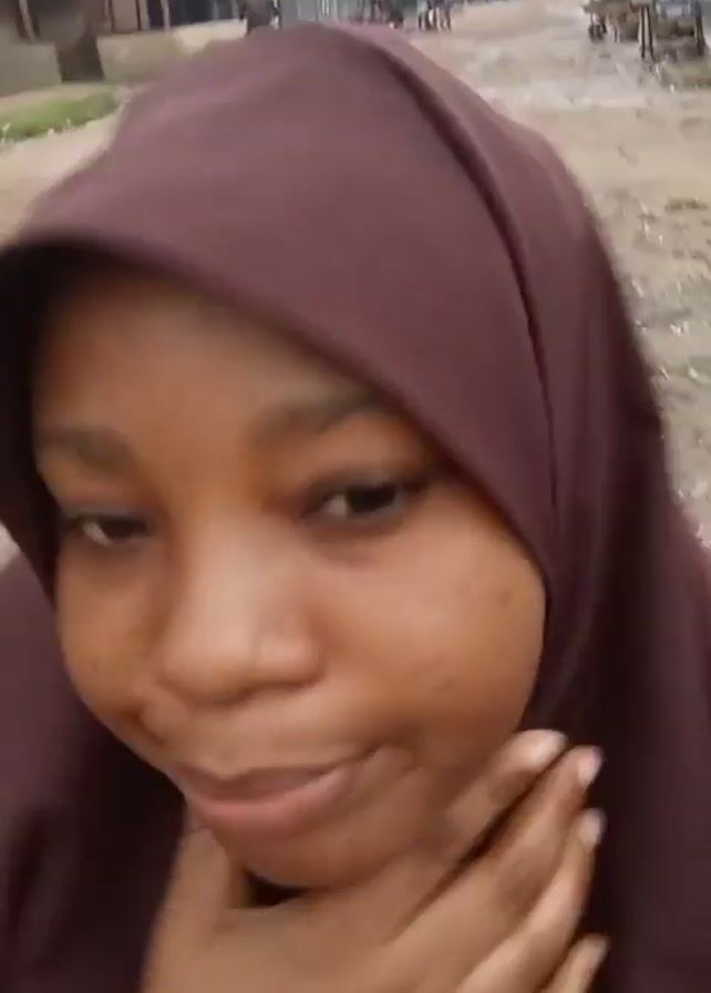 A woman with dark skin and brown eyes, wearing a dark brown hijab, is recording a selfie video. She is outdoors on what appears to be a dirt road in a rural area. Buildings are visible in the background, along with trees and power lines. The road appears damp or wet. The woman looks at the camera and makes various facial expressions, including smiling, pursing her lips, and touching her neck. There is the sound of a vehicle passing by in the background.