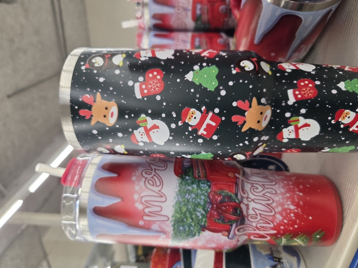 - "The image displays two tall, insulated beverage tumblers positioned on a light-colored shelf within an indoor retail environment, illuminated by overhead fluorescent lighting" by FM-yER7B2, licensed under CC BY 4.0