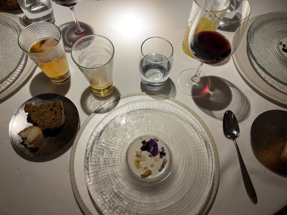 A high-angle shot reveals an elegant table setting with a focus on dining. There are glasses of water, beer, and red wine, each partially consumed. Two plates hold small bread portions and another contains a creamy soup garnished with herbs and edible flowers. A spoon rests beside the soup plate. The setup suggests a refined dining experience.