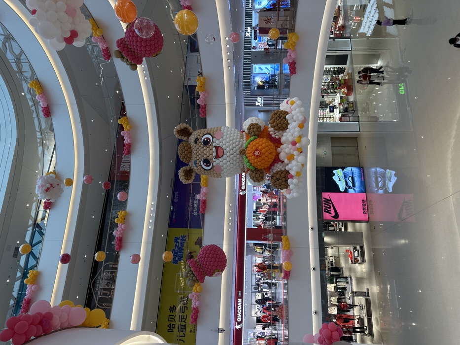 This image depicts a multi-story shopping mall atrium located in Baiyun District, China. The scene is brightly illuminated, featuring numerous curved architectural levels with glass railings overlooking a central open space. The primary decorative element is a large, central balloon sculpture of a brown and white cartoon-style animal, resembling a hamster or squirrel, positioned at mid-height in the atrium. This sculpture holds an orange or tangerine, crafted from smaller orange balloons, which contains a Chinese character (吉 - "jí" meaning auspicious/lucky). It rests on a base of white and colorful smaller balloons. Other balloon arrangements include pink, yellow, and white garlands along the railings of multiple floors, and various spherical balloons of similar colors suspended at different heights throughout the atrium. A distinct pink, fish-shaped balloon sculpture is visible to the left of the central animal figure, and another to the right. Retail stores are visible on various levels. On a middle level, a "QIADAN" sports store is clearly identifiable with its red signage. On a lower level, a large vertical digital display board advertises "NIKE RUN" featuring a green athletic shoe against a vibrant pink background. Other generic storefronts displaying clothing and shoes are visible on multiple floors. Scattered individuals and small groups of people are present across the different levels of the mall. On the brightly reflective ground floor, a group of three individuals walks towards the right, while another solitary individual is visible further to the right. People are observed walking or standing within or near the visible retail spaces on higher floors. No specific interactions or detailed actions are clearly discernible due to the overhead perspective and distance. The flooring is a highly polished, light-colored material, creating strong reflections of overhead lights and display screens on the ground level. The environment is clean and well-maintained.
