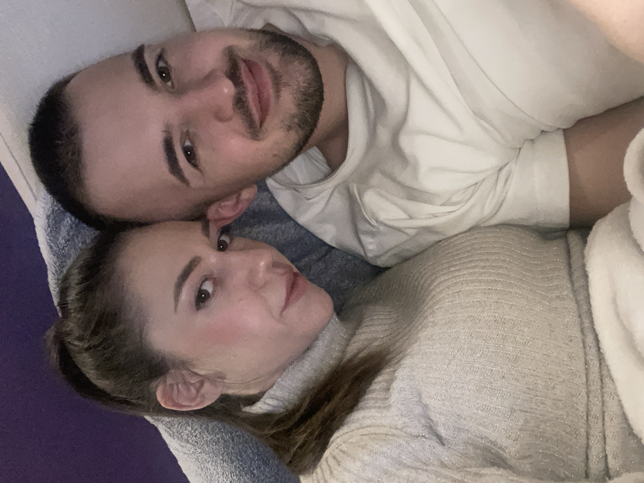 This image depicts a close-up indoor portrait of two individuals, an adult female and an adult male, likely taken in the city of Sofia, Bulgaria. Both are positioned closely together, facing and looking directly at the camera. The female, on the left, has dark hair styled in a high ponytail. She wears a light beige or off-white ribbed turtleneck sweater with a subtle sheen. Her expression is neutral to slightly smiling. The male, on the right, has short dark hair and light facial stubble. He wears a plain white short-sleeved t-shirt and displays a broad smile. A light blue or grey textured fabric, possibly a blanket or pillow, is visible behind and between them, with a darker purple-blue background section behind the female. A soft white or light-colored fluffy fabric, possibly another blanket, covers the lower portion of the frame in front of both individuals. The lighting appears soft and even, suggesting an indoor setting.