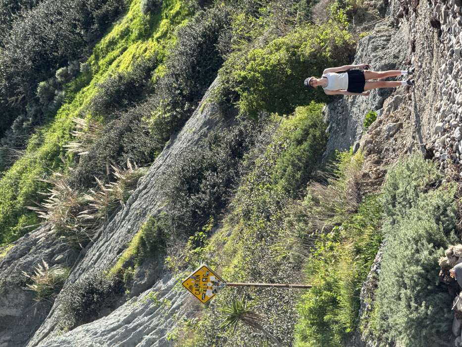 A single individual stands on a rocky path at the base of a steep, vegetated slope in Palos Verdes Estates, United States