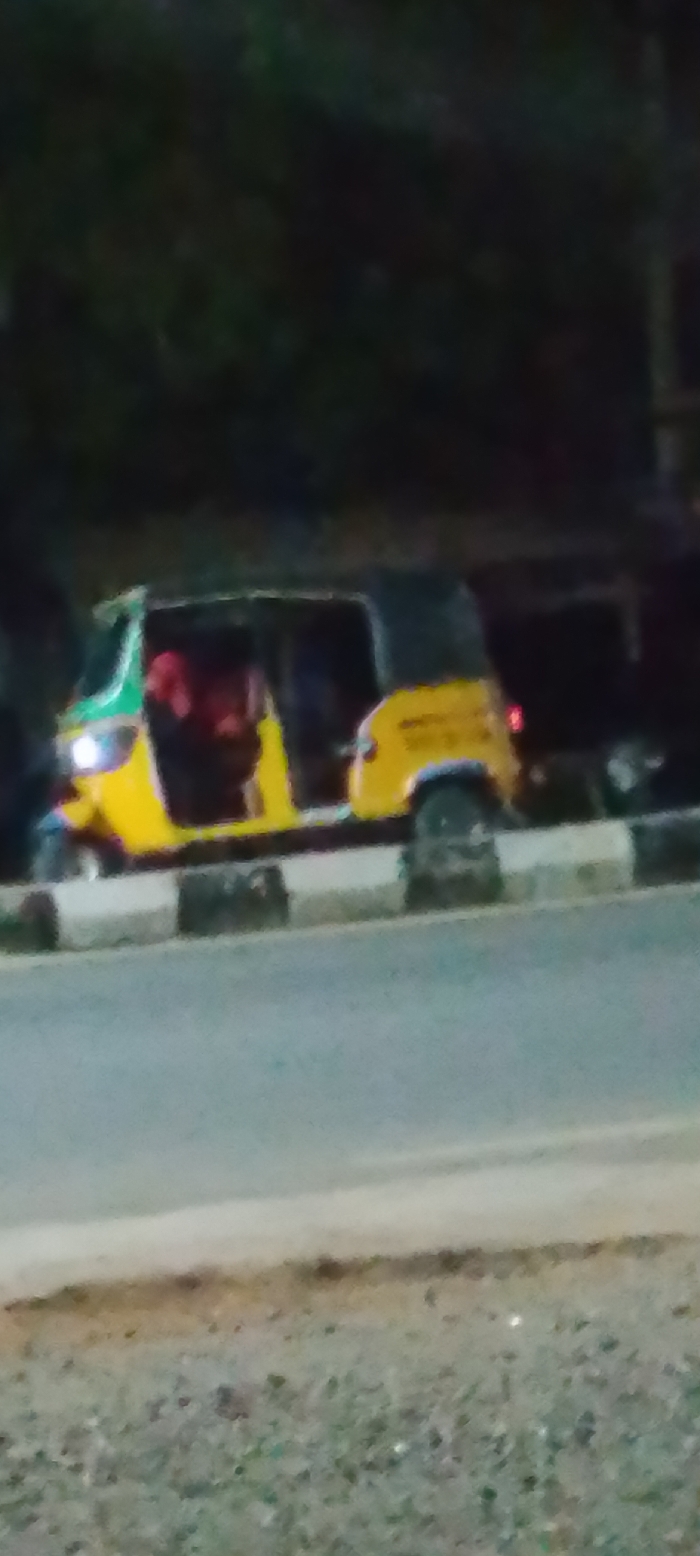 In Zango-ndaji, Nigeria, a three-wheeled vehicle, specifically a yellow and green motorized rickshaw (Keke Napep) with a black canopy, is positioned next to a road at night. The vehicle's front headlight is illuminated. An indistinct figure, appearing to wear red clothing, occupies the driver's seat. The vehicle is situated parallel to a concrete curb painted with alternating black and white stripes. A dark asphalt road surface is visible in the foreground, and the background consists of dark, indistinct shapes, possibly trees or structures, indicative of low-light conditions. The vehicle appears to be either stationary or moving slowly.