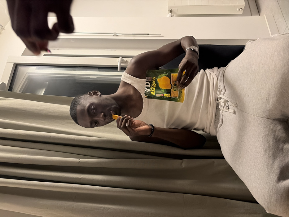 The scene is an interior room in Paris, France. A young adult male with dark skin and a short fade haircut is seated, looking directly at the viewer. He wears a white tank top, light grey sweatpants with a visible drawstring, a dark beaded bracelet on his left wrist, and a silver-toned wristwatch on his right. He is in the act of consuming a piece of dried mango, holding a yellow-orange strip to his mouth with his left hand. In his right hand, he holds a green and yellow pouch labeled "7D Dried Mangoes - Cebu - Philippine Brand." The background features light-colored curtains to the left, and a white-framed window or glass door with a white handle to the right. A white panel radiator is visible against a white wall in the far right. A partially visible hand, possibly belonging to another individual, appears in the upper right quadrant, featuring a finger with a pink-colored tip.