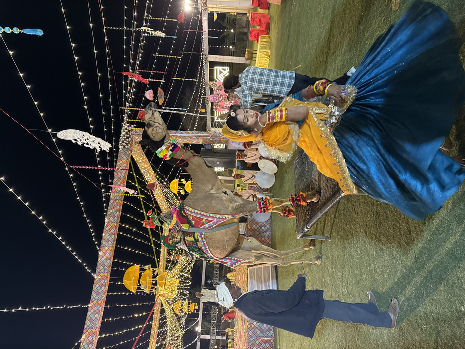 A woman in a vibrant yellow and blue dress is posing next to a decorated camel. The camel is adorned with colorful ornaments and stands beneath a structure illuminated with numerous string lights. A man in a blue jacket and grey pants stands in the foreground, observing. The event seems festive, possibly a cultural celebration, set on a grassy area with more lights and decorations in the background.