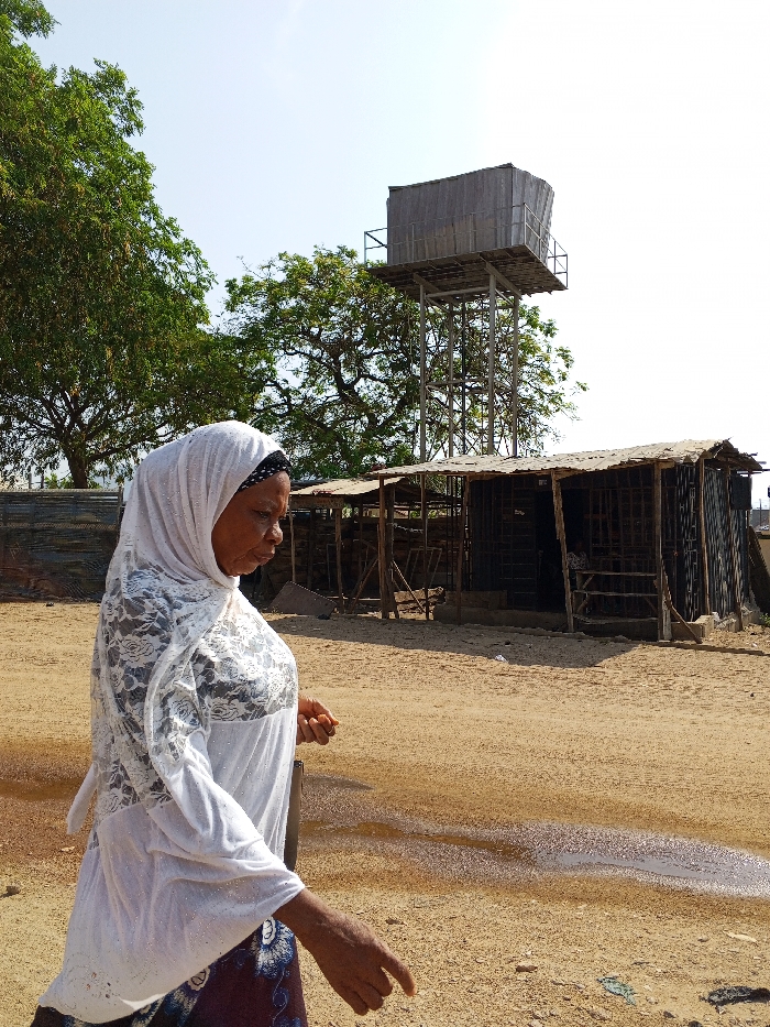 An adult female, appearing middle-aged or older, walks from left to right across a dry, unpaved area in Otokiti, Nigeria. She is dressed in a white head covering with a black patterned band, a white long-sleeved top featuring a lace-like pattern over a darker undergarment, and a dark patterned lower garment. Her right hand is visible, holding a small, reddish-brown object. In the background, several single-story, rudimentary structures with wooden frames and corrugated metal roofs stand on elevated bases, likely functioning as market stalls or shops. Behind these structures and towards the right, a tall, multi-story metal-framed water tower supports a rectangular tank constructed from light-colored, possibly corrugated material. Large green trees are visible in the background, primarily on the left and central-right. The ground consists of light brown earth, with a notable elongated wet patch or small puddle in the mid-ground. The scene is brightly lit by direct sunlight under a clear sky.
