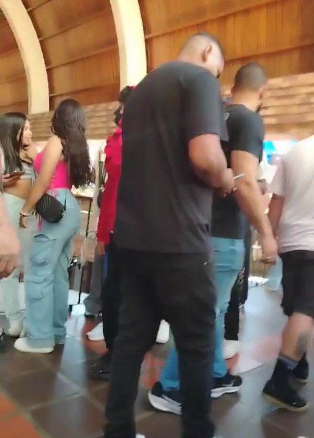 gathering of people indoors, under a wooden-paneled roof. The floor is tiled with alternating light and dark squares. The people are of varying ages and are dressed in casual clothing, including jeans, t-shirts, and hoodies. Some are wearing hats or sunglasses. Several individuals are seen walking around, suggesting the atmosphere is relaxed and social. The presence of a girl in a pink top and a boy in a pink hoodie indicates the event may be family-oriented. The overall scene appears to be a casual gathering, possibly a party or public event, taking place indoors.
