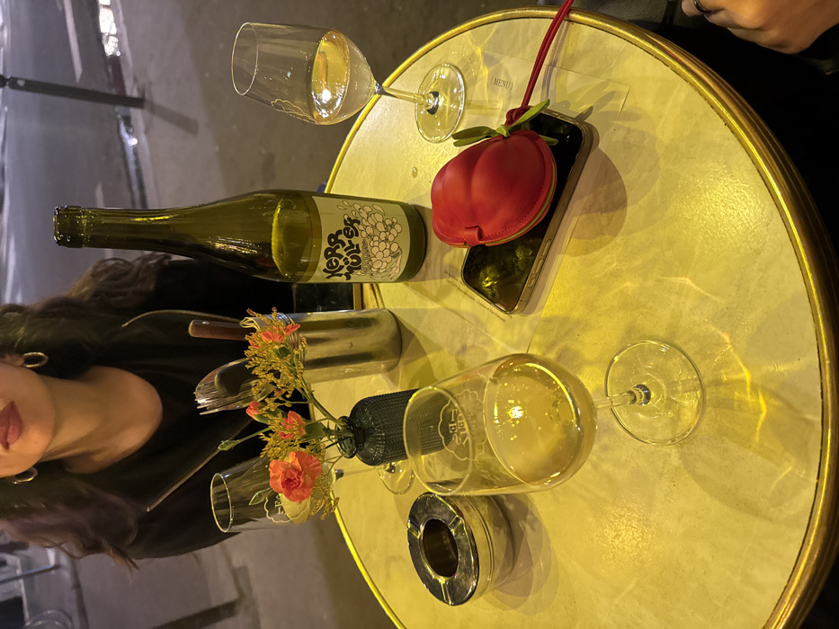 The image depicts an outdoor café table scene at night in Paris, France. A female individual, partially visible from the chest up in the upper center, has long dark hair, wears a black top, and gold hoop earrings. Her lips are stained a dark red. The central focus is a round, light-toned tabletop with a brass-colored rim. Objects arranged on the table from left to right include: a chrome-plated ashtray; a clear stemmed wine glass filled with a pale yellow liquid; a dark blue, textured vase containing three orange flowers resembling carnations and yellow filler foliage; a silver cylindrical container holding a fork and a knife; a dark green glass wine bottle labeled "Kerr Müller," featuring white grape illustrations, partially full; a smartphone resting flat; a red, fruit-shaped (resembling a peach) leather coin purse or small bag with green leaf and stem details, positioned atop the smartphone; and another clear stemmed wine glass, approximately half-full of a pale yellow liquid, with a faint "MENU" text visible on a paper underneath it. The background shows a blurred urban street scene at night, with reflections on a dark, wet surface consistent with city pavement. The overall ambiance suggests a relaxed evening setting at a Parisian establishment.