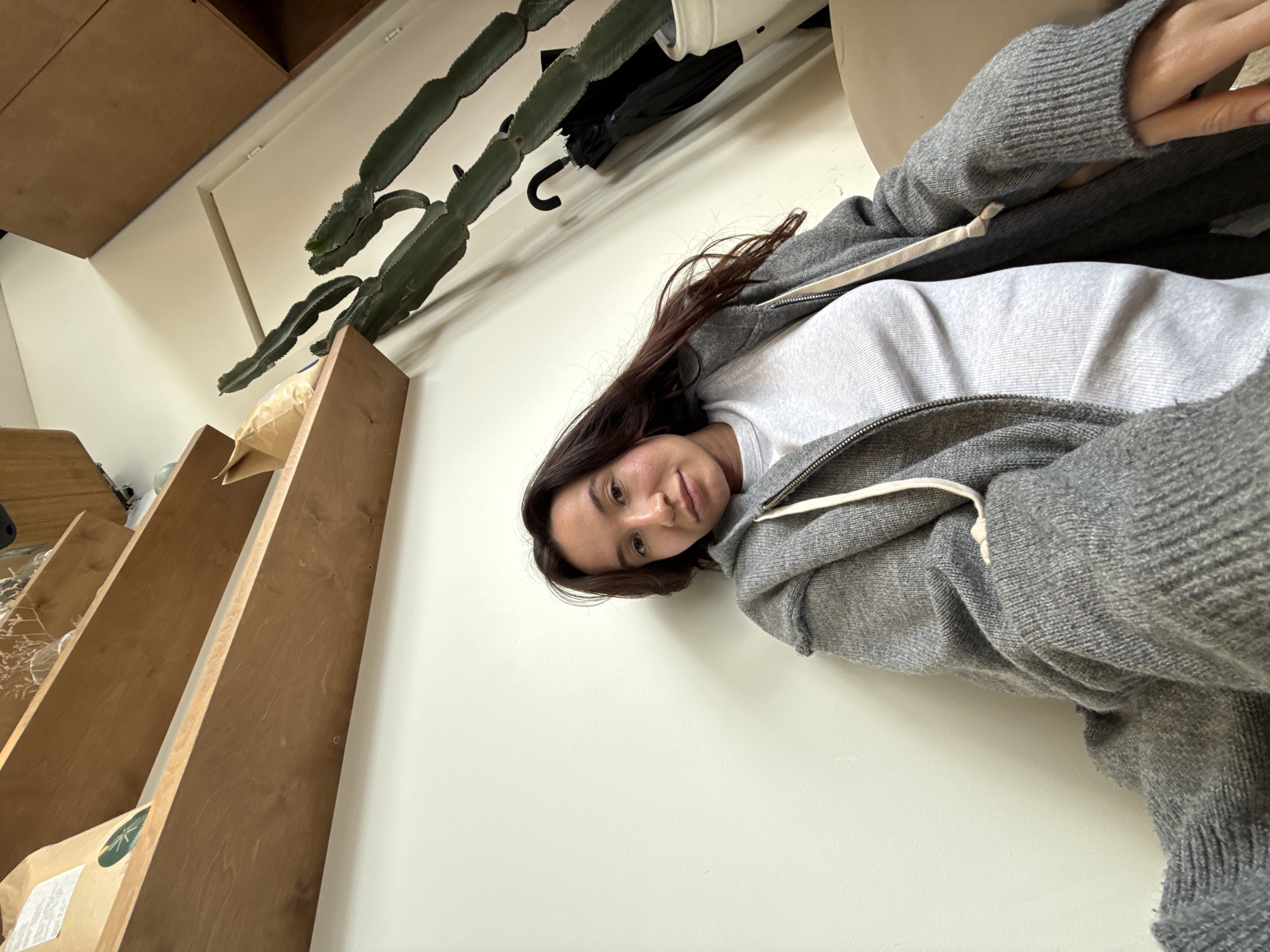 The image captures an indoor scene in Al Jizah, Jordan. A female individual with dark brown hair and a light complexion is positioned towards the center-right, appearing to be seated or leaning against a light-colored wall. She is wearing a light grey ribbed t-shirt under an open, grey knitted zip-up hoodie featuring white drawstrings. Her right hand rests on a beige surface, possibly a chair armrest. The background consists of a light-colored wall. To the upper left, three wooden shelves are visible, displaying items including a brown paper bag with a green logo and dried botanical arrangements in glass containers. To the right, a tall, multi-stemmed cactus plant stands in a white pot. A black folded umbrella is leaning against the wall behind the cactus. A portion of a wooden cabinet or shelving unit is also visible in the upper right corner of the frame. The image is taken from a slightly low-angle perspective.