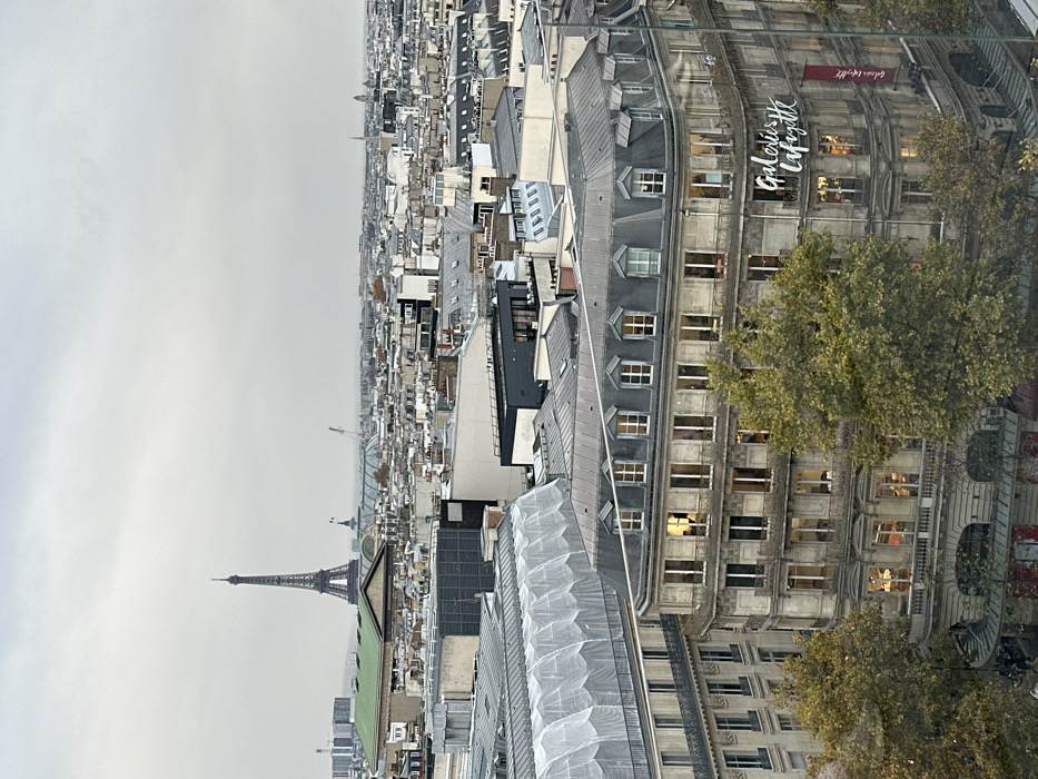 The image displays an elevated view of the Paris cityscape on an overcast day, extending towards the west-southwest. In the near foreground, the upper sections of a large, ornate Haussmannian-style corner building are visible, featuring light-colored stone facades, numerous windows, and a dark, pitched Mansard roof punctuated by dormers. A prominent white sign displaying "Galeries Lafayette" is affixed to its exterior, alongside a vertical red banner. Autumnal trees partially obscure the lower levels of this building. Adjacent to it on the left, another significant building is covered by white protective sheeting or scaffolding, indicating construction or renovation. The midground is characterized by a dense arrangement of typical Parisian buildings, predominantly Haussmannian architecture with light-toned stone and grey zinc or slate roofs, many featuring dormer windows and chimneys. Interspersed among these are some modern constructions with flat roofs. In the distant background, the Eiffel Tower stands as a dark, distinct silhouette against the light grey sky, positioned to the left of the central axis. To the right of the Eiffel Tower, the recognizable green roof and glass dome of the Grand Palais are visible. The far horizon shows a continuous urban sprawl with additional buildings and faint indications of industrial structures or cranes. No individual people or specific actions are discernible within the frame.