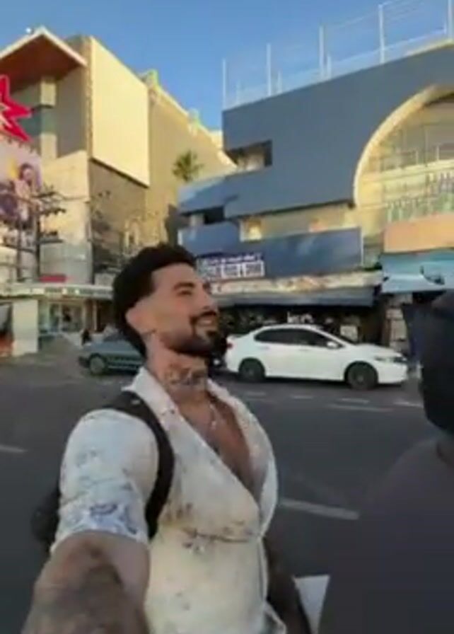A man with a dark beard and tattoos records a selfie video while riding on the back of a scooter on a city street under a bright blue sky