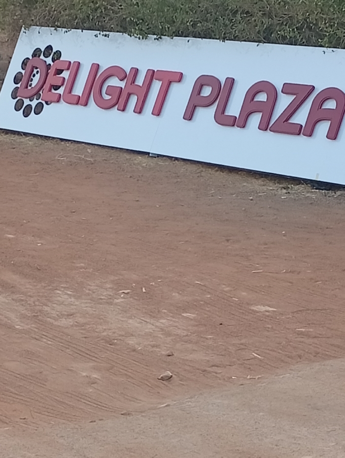 A sign reading "DELIGHT PLAZA" in red, 3D block letters with a floral-like logo on a white background is positioned above a barren, dirt-covered landscape
