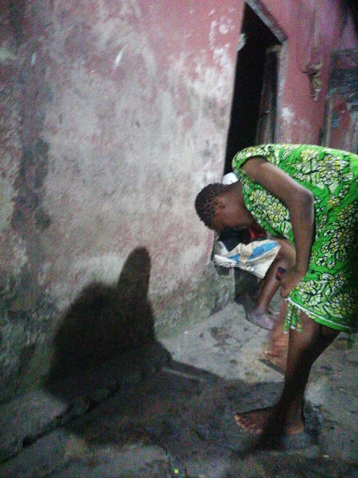 A woman in a green patterned dress cradles a child wrapped in fabric near a wall and doorway. The wall is textured with patches of faded pink and grey. The woman is barefoot, bending over the child. A dark, indistinct shadow stretches across the ground and up the wall, likely cast by the individuals. The overall lighting is dim, creating a somber atmosphere.