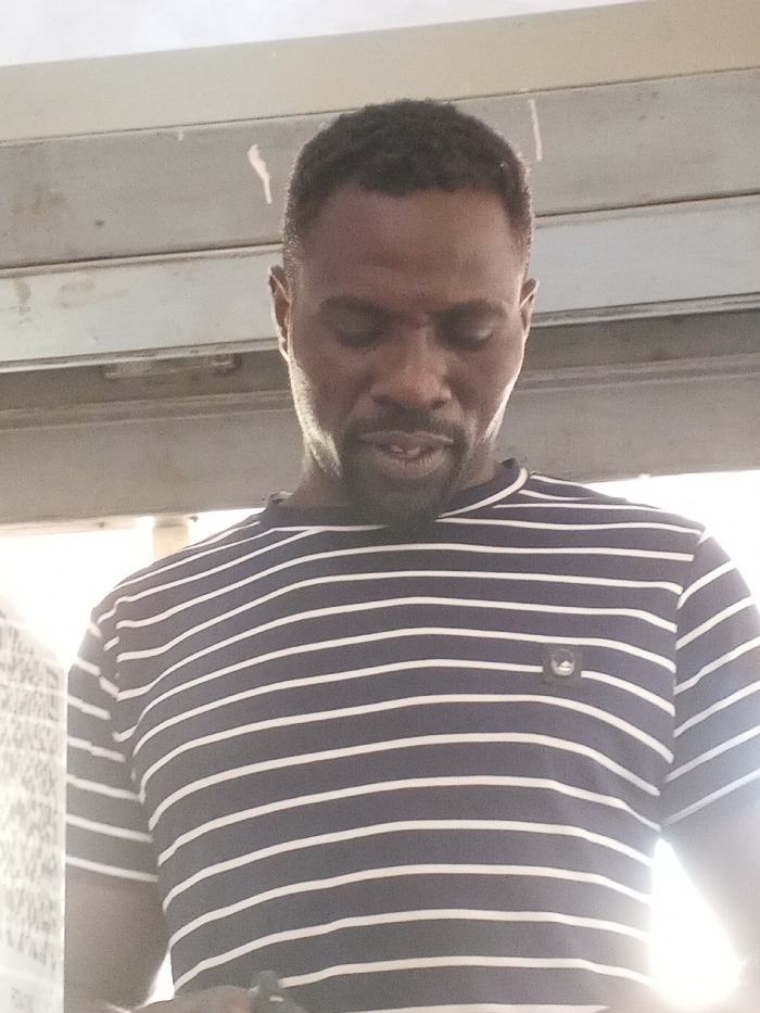 An adult male subject is depicted in a close-up, chest-up portrait shot, positioned indoors or within a sheltered area. The individual has dark skin, short dark hair, and a trimmed beard and mustache. He is wearing a short-sleeved navy blue t-shirt with numerous horizontal white stripes, and a small, dark, circular emblem is visible on the left side of his chest. His head is tilted downwards, and his gaze is directed off-frame, downwards. His mouth is slightly ajar. His hands are partially visible at the bottom of the frame, holding an unidentified dark object. The background consists of light-colored, horizontal structures, possibly metallic beams or panels, with an indistinct, light-toned patterned surface visible on the left. The scene is brightly lit, with a prominent light source or reflection in the lower right quadrant. The location is Unknown, Unknown.