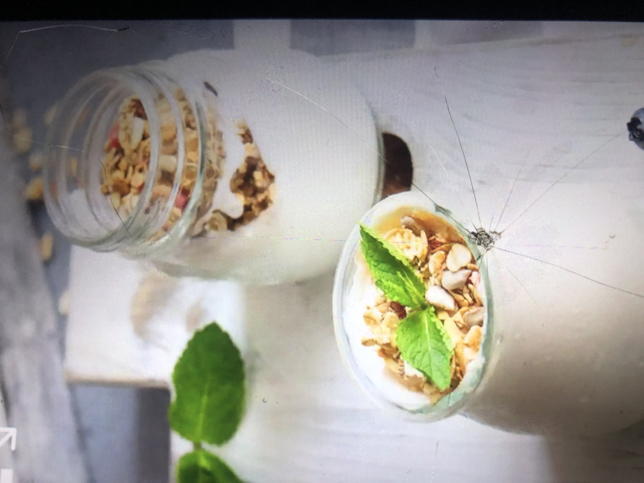 The image depicts an indoor food presentation, not Akpaka Forest Reser, Nigeria. Two glass containers holding layered food are centrally featured on a light-colored, possibly wooden, surface. In the foreground, a clear glass cup contains a white substance (likely yogurt or cream) topped with granola, assorted nuts, and a fresh green sprig of mint. Behind it, a larger, out-of-focus glass jar also contains layers of white substance and granola. Additional green mint leaves are visible in the blurred background, and a single dark blueberry is present at the bottom right. The image itself, appearing as a photograph of a display screen or print, displays a significant star-shaped crack with radiating lines originating below the foreground glass cup and extending across the lower portion, alongside other minor surface scratches. A partial white arrow icon is visible in the top left corner of the overall image frame. No individuals are present.