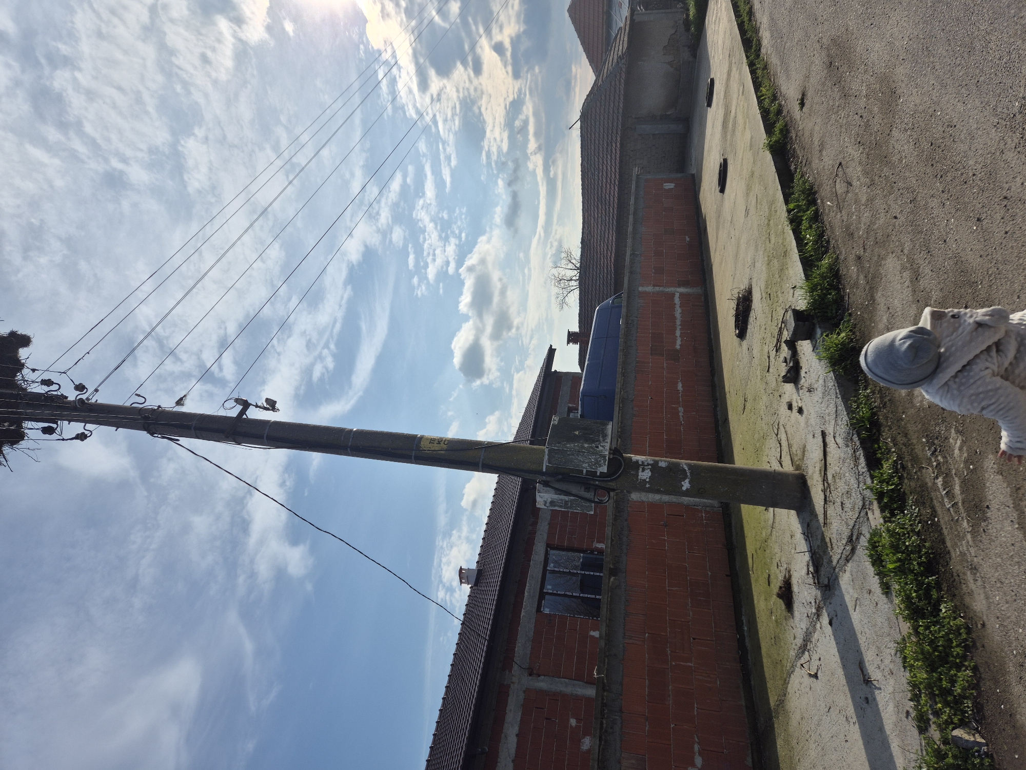 A low-angle shot captures a sunny outdoor scene in Mechkarevo, Bulgaria. In the foreground, an indistinct figure of a child stands along the edge of a concrete curb and weathered asphalt road. Behind them, a red brick building extends toward the right, with a visible window and a blue object on the roof. The building's exterior is adjacent to the concrete curb, which is interspersed with patches of green grass. An aged utility pole is positioned prominently in the frame, extending diagonally from the lower left to the upper center. Multiple wires extend from the top of the pole, bisecting the view of a partly cloudy sky. The clouds are white against a blue backdrop, with the sun slightly obscured. The scene is bathed in sunlight.