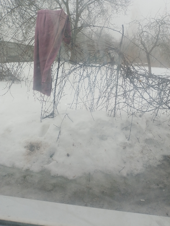 The scene depicts a winter landscape in Yarun, Ukraine, observed through a partially obscured, possibly frosted or reflective surface at the bottom. The foreground is dominated by a snow-covered ground, which transitions into a visible layer of ice or slush, with some dark debris present in the lower left. A piece of maroon-colored fabric, resembling trousers or a large cloth, hangs vertically draped over a bare, thorny tree branch, positioned slightly left of the image center. Numerous leafless branches and tangled bushes form a dense visual barrier across the middle ground. In the background, a wooden fence and indistinct, possibly rural, structures are partially visible through the sparse winter trees and an overcast or foggy sky. No individuals, actions, or interactions are discernible.