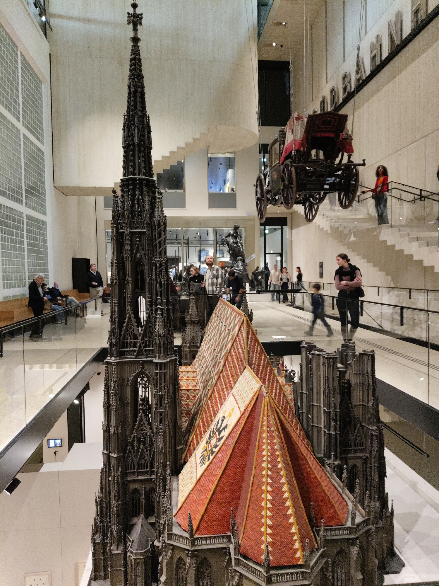multi-level interior space, appearing to be a museum in Vienna, Austria. The main focus is a large, intricate model of St. Stephen's Cathedral. The model features a detailed spire and a roof with a decorative tile pattern of orange, white and black, resembling the coat of arms of Austria. People are present on different levels, some walking, others seated. A horse-drawn carriage is suspended from the ceiling. The architecture of the building includes modern elements such as glass walls and a wide staircase.
