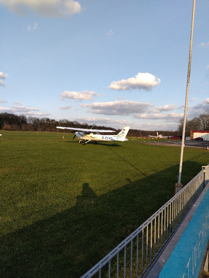- "The image depicts an outdoor scene at Flugplatz Rheine-Eschendorf (Rheine-Eschendorf Airfield) in Rheine, Germany, under a partially cloudy blue sky during what appears to be late afternoon or early morning due to long shadows" by FM-T6ZDc2, licensed under CC BY 4.0
