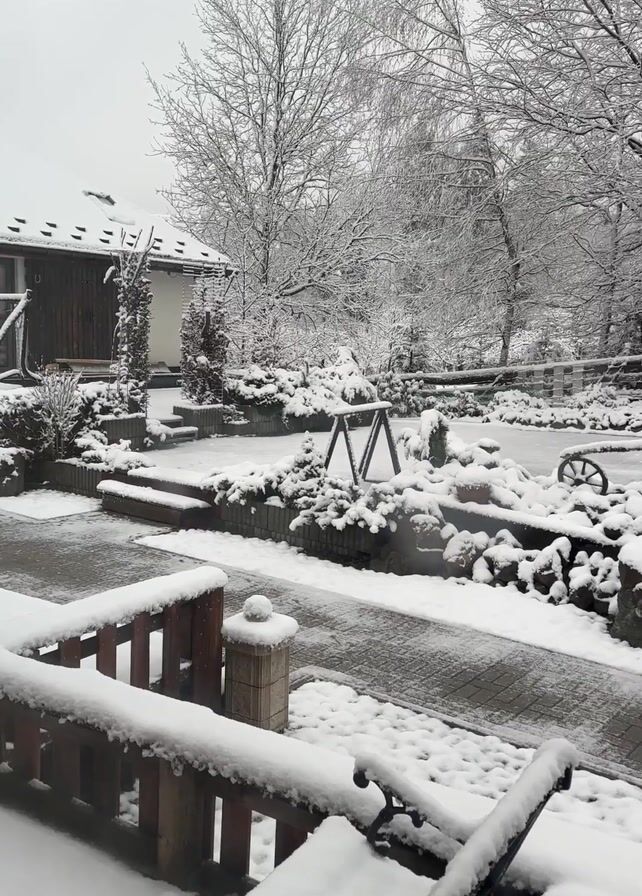The video displays a winter landscape covered in snow. The scene includes a building with a sloped roof, various trees, and decorative elements like wagon wheels and stone formations, all heavily coated with snow. A wooden railing and a bench are visible in the foreground, also covered in snow. A baby's cooing and sounds of contentment can be heard.
