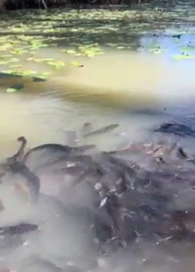 large group of dark-colored fish swimming in a body of murky water, gathered near a tree trunk on the water's edge. Lily pads float on the water's surface in the background. The fish are close together, creating a dense mass in the water. The camera shifts slightly, revealing more of the surrounding environment, including the tree and the vegetation on the far bank of the water. A child can be heard speaking in the background.