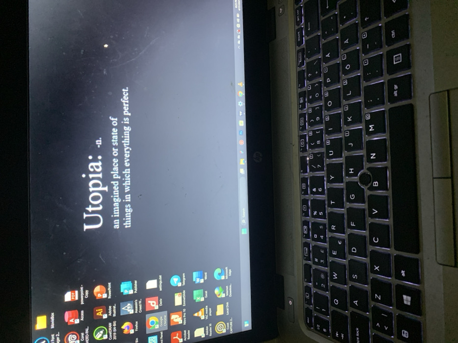 A silver HP laptop computer sits on a dark surface. The screen is on, displaying the definition of "Utopia" in white text against a dark gray background. The definition reads, "an imagined place or state of things in which everything is perfect." The desktop background is a dark gray with various icons arranged in a grid pattern. Some of the icons are for programs, including: Adobe Illustrator, Photoshop, PowerPoint, Acrobat Reader, Firefox, Google Chrome, Nitro Pro 10, Emmetlide, Telegram, VLC media player, Excel, Word, Notepad, and others. The taskbar at the bottom of the screen shows the search bar, the HP logo, and several other open browser windows. The laptop's keyboard is backlit, illuminating the white keys in a dim room. The laptop is in a dark, seemingly private location. The coordinates provided do not correspond to a specific address or location in Umuola, Nigeria.
