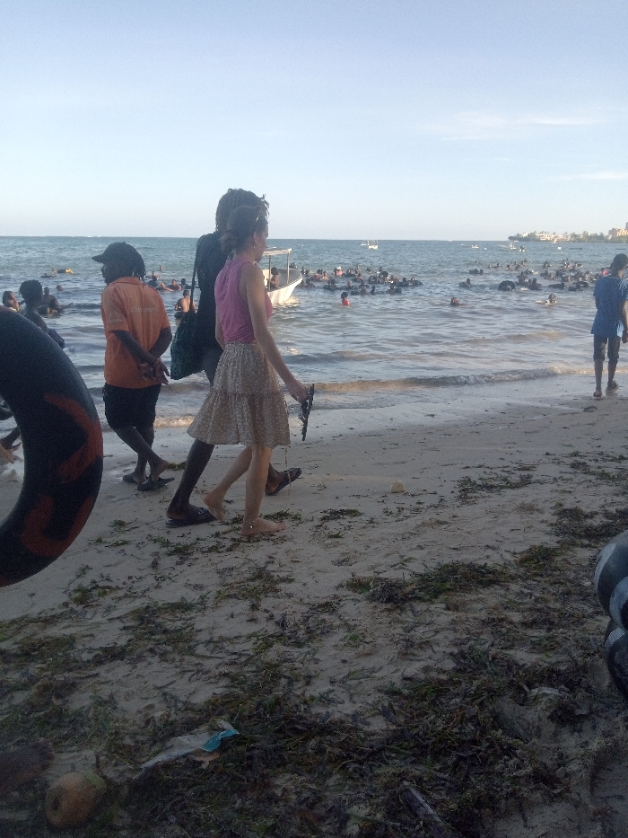 The image depicts a crowded beach scene in Shanzu ward, Kenya, under a clear, light blue sky during what appears to be late afternoon