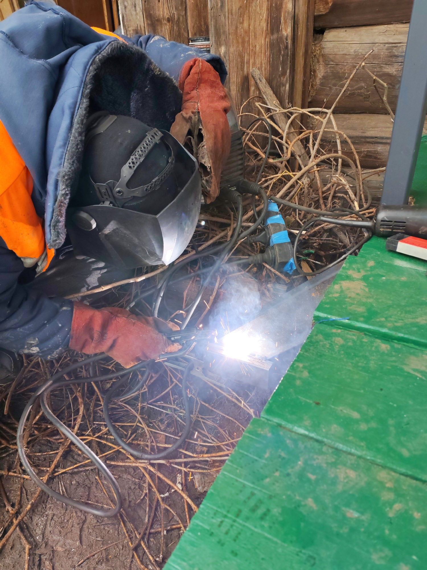 In Chaikovsky, Russia, an individual wearing protective welding gear—including a dark blue jacket with orange accents, a black welding mask, and red gloves—is performing a welding operation. The work area is cluttered with dried branches and electrical cables. A green wooden surface is partially visible on the right side of the frame. The background shows a log structure. The welding process is actively occurring, producing bright sparks.