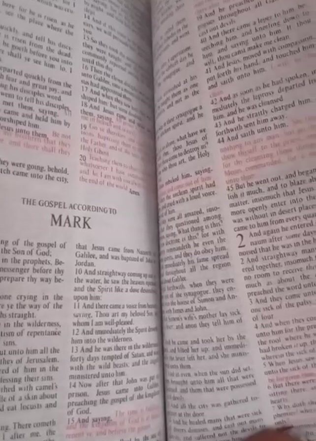 A person holds open a Bible, revealing a highlighted passage from "The Gospel According to Mark" on the left-hand page