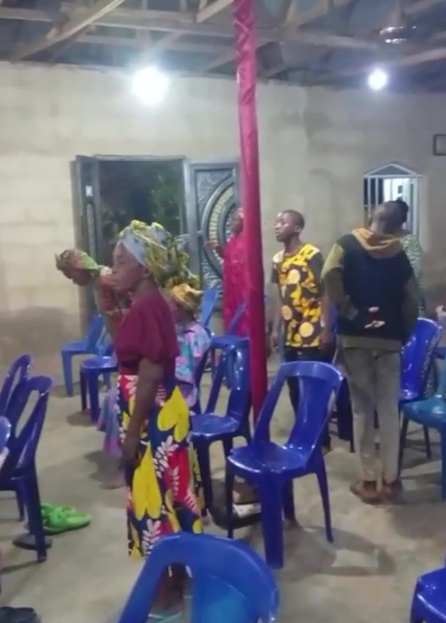 Inside a room with a corrugated metal roof, blue plastic chairs are scattered about. A tall, skinny pink fabric pole stands in the middle. Around the room, about ten people are dancing and clapping their hands. One young man in a yellow and black shirt stands in front and looks at the camera while others dance around him. The room is lit by a bulb overhead.