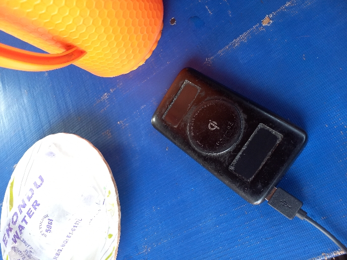 A close-up, slightly overhead photograph reveals four distinct objects arranged on a blue, textured surface, possibly a plastic sheet or tablecloth, exhibiting minor wear and dust accumulation. In the upper left, a flattened white plastic sachet, printed with "EKONDU WATER," "NET VOLUME 50cl," and "REG. NO: E1-6137L" in purple text, rests on a white paper plate featuring a subtle green and brown decorative edge. Occupying the central and lower portions of the frame is a heavily scuffed, black rectangular power bank or wireless charging device. It displays a circular "Qi Wireless power bank" logo with the Qi symbol and two unlit rectangular display areas. A black USB-A cable is inserted into its left side, extending out of the frame. In the upper right quadrant, a portion of an orange plastic pitcher, characterized by a honeycomb texture, is visible. The scene is located in Oturkpo, Nigeria, as indicated by the "EKONDU WATER" branding. No individuals are depicted.