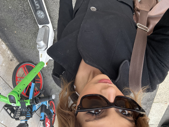 A medium-shot, high-angle selfie captures a young adult female on a city street in Milan, Italy. She wears black Ray-Ban sunglasses and a dark, possibly black, collared coat, with a brown shoulder bag slung over her left shoulder, displaying a silver-colored buckle on its strap. Her hair is medium brown and wavy, and she exhibits winged eyeliner with light-colored lipstick. To her right, a white Lime electric scooter is prominently featured, identifiable by its bright green handlebars and part of its deck, with a digital display showing "55". Behind the scooter, a blue and red shared bicycle is partially visible. The ground is a paved surface, and a segment of a white pedestrian crossing line is discernible on the far left. The scene reflects a typical urban environment with accessible shared mobility services.